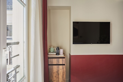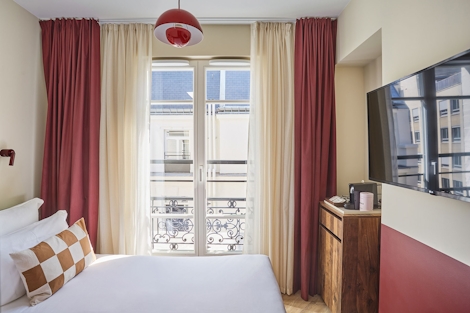 This comfortable room offers 17 sqm of space. Ideal for up to two people, its double bed (160x200) and modern bathroom with shower make this stay a perfect way to experience Paris. There’s also sustainable coffee, a kettle and a mini fridge, so you’ll have everything you need for maximum comfort and minimal stress.