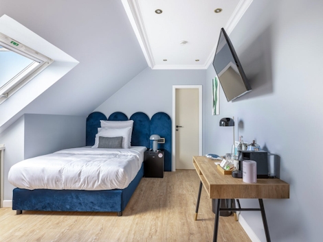 The recently renovated 13 square metre intimate rooms consist of a bedroom with a queen-size bed (140x200) and an ensuite bathroom with shower. All rooms include a workspace with a desk, perfect for working remotely. The rooms can accommodate up to 1 person.
