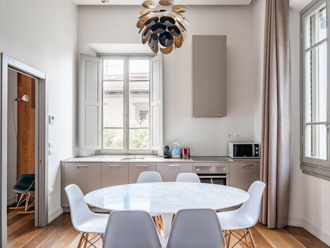 This thoughtfully designed apartment extends over 78 m² and accomodates up to 6 people. Its contemporary style and calming environment make the space ideal as a home office. The space includes a living area with a double sofa bed and two (2) charming bedrooms, each with a double bed. The apartment also offers two (2) modern bathrooms. For our traveling chefs in search of a home-cooked meal, the air-conditioned apartment also comes with a beautiful fully-equipped kitchen and a dining table.