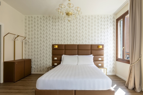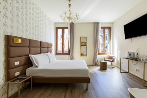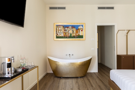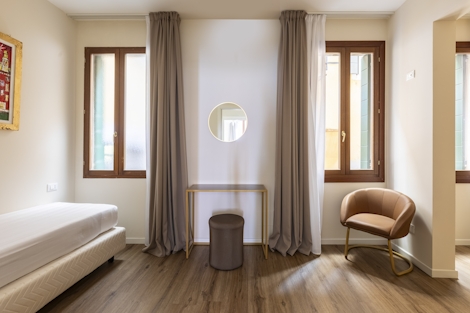 This comfortable suite offers 47 sqm of space. Ideal for up to 4 people, the two single beds (90x200x2), a double bed (160x190) and modern bathroom with a bathtub make this stay a perfect way to experience Venice. The suite also offers sustainable coffee, a kettle and a mini fridge, so you’ll have everything you need for maximum comfort and minimal stress.